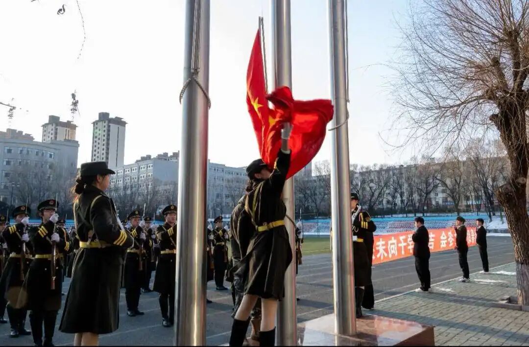 晨光里,五星红旗冉冉升起,全体师生肃立注目,共唱国歌。庄严的旋律里,是同学们对祖国的热爱,更是助力大冬会,奋进向未来的青春誓言!
